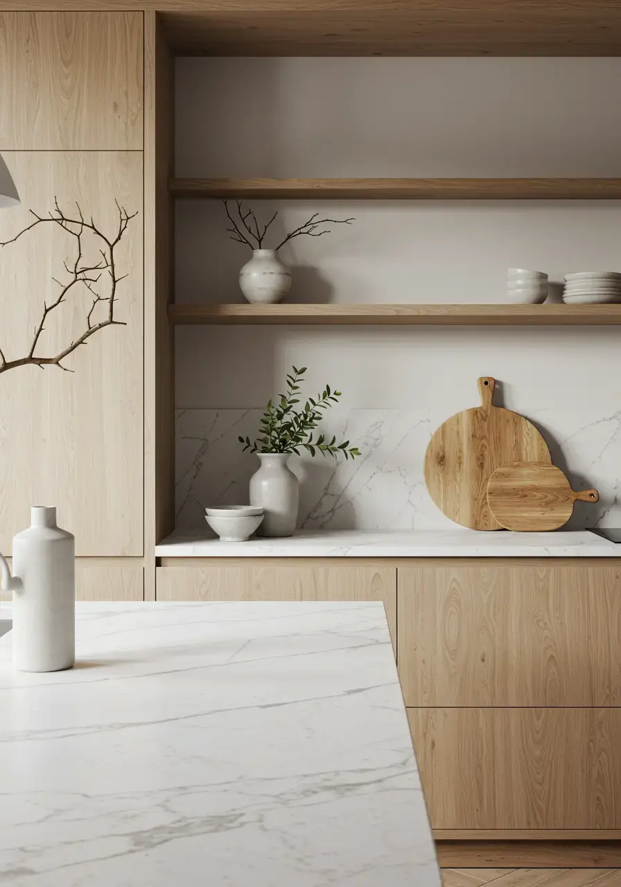 • Opt for linen tea towels or a small ceramic vase with a single branch to introduce soft, natural textures.