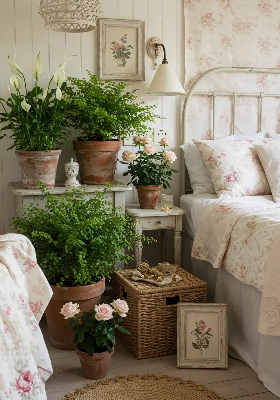 - Place potted plants like ferns, peaceful lilies, or small roses in vintage pots or distressed terracotta planters.