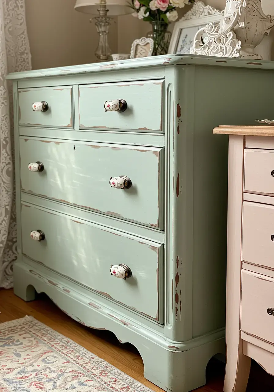 - Choose furniture with a distressed finish, such as a weathered white dresser or a painted iron bed frame.