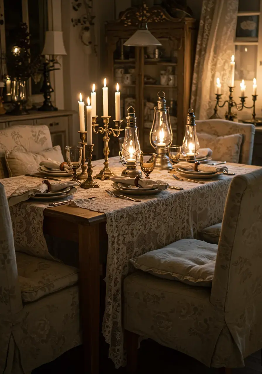 It creates a beautiful, inviting glow that enhances the vintage charm of your decor, making guests feel comfortable and relaxed. Soft lighting also flatters everyone at the table.