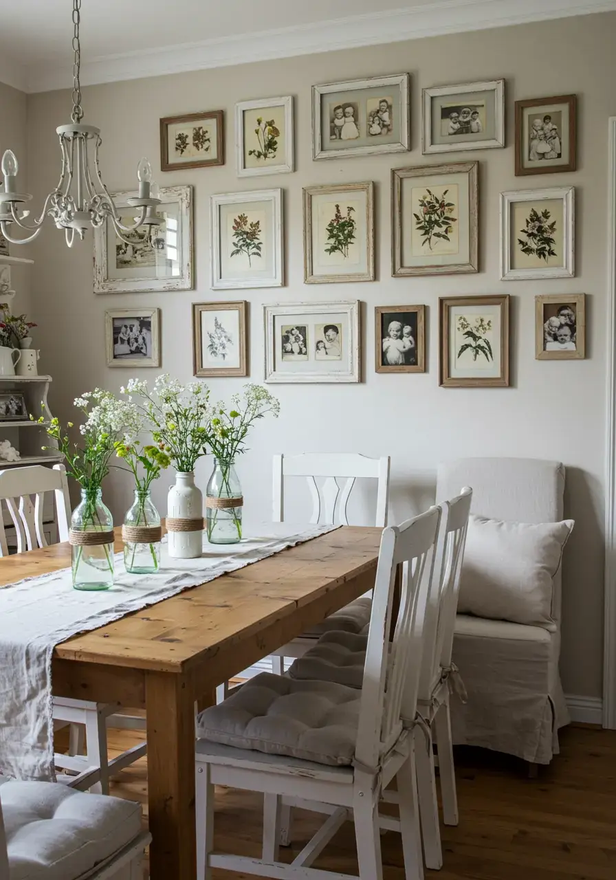 - Create a gallery wall using antique photo frames, painted in varying shades of white and cream, filled with botanical prints or family photos.
