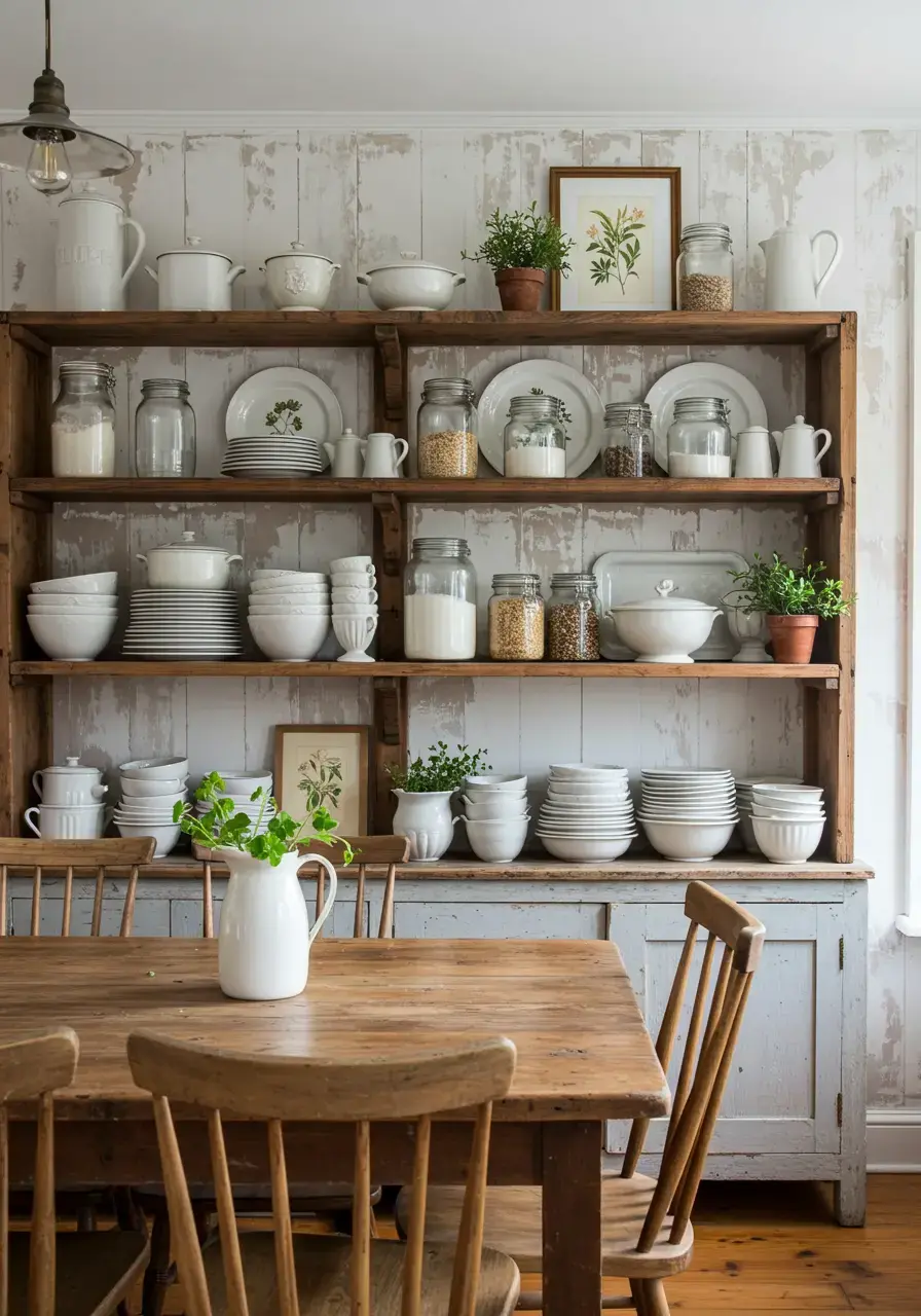 - Install rustic wooden shelves or distressed white painted shelves on a prominent wall in your dining room.
