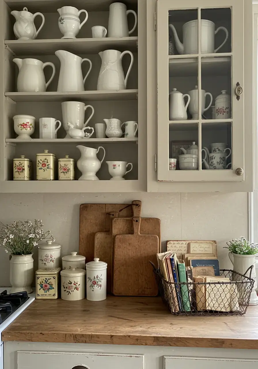 - Group collections of white ironstone, vintage teacups, glass milk bottles, or antique kitchen tools on open shelves or in glass-front cabinets.