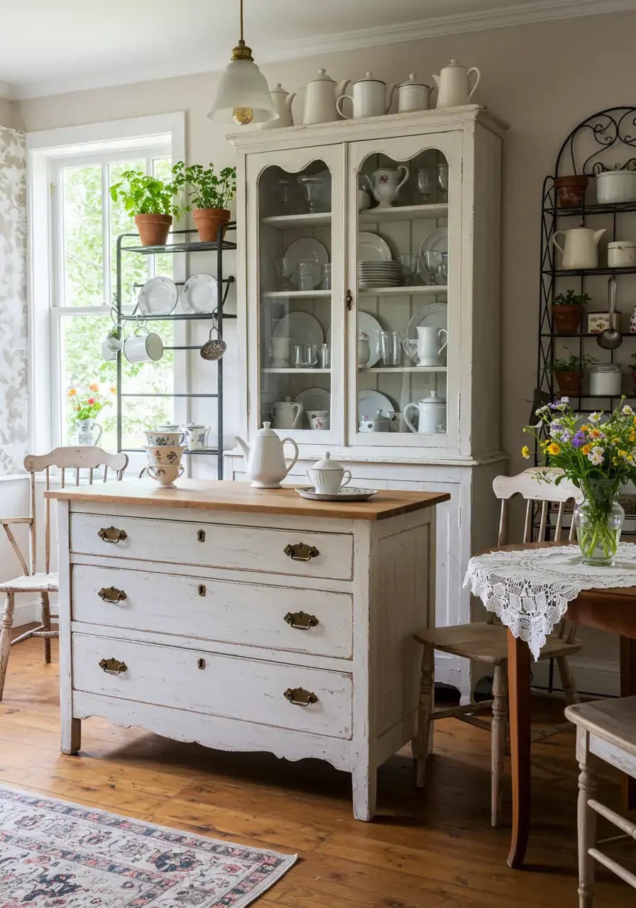 - Use a vintage hutch or display cabinet to showcase dishware or glassware.