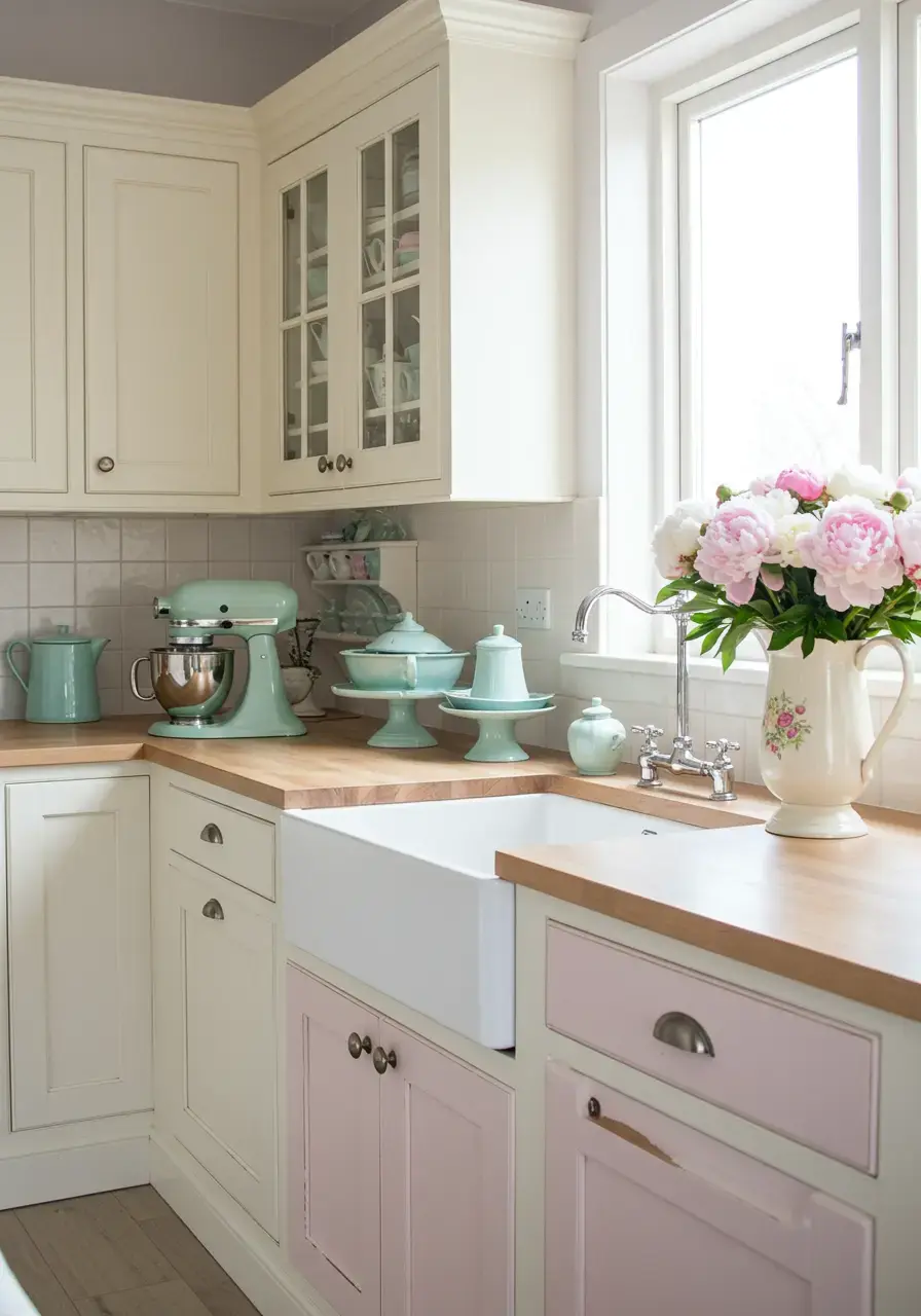 - Incorporate pastel accents through dishware, small appliances, or floral arrangements.
