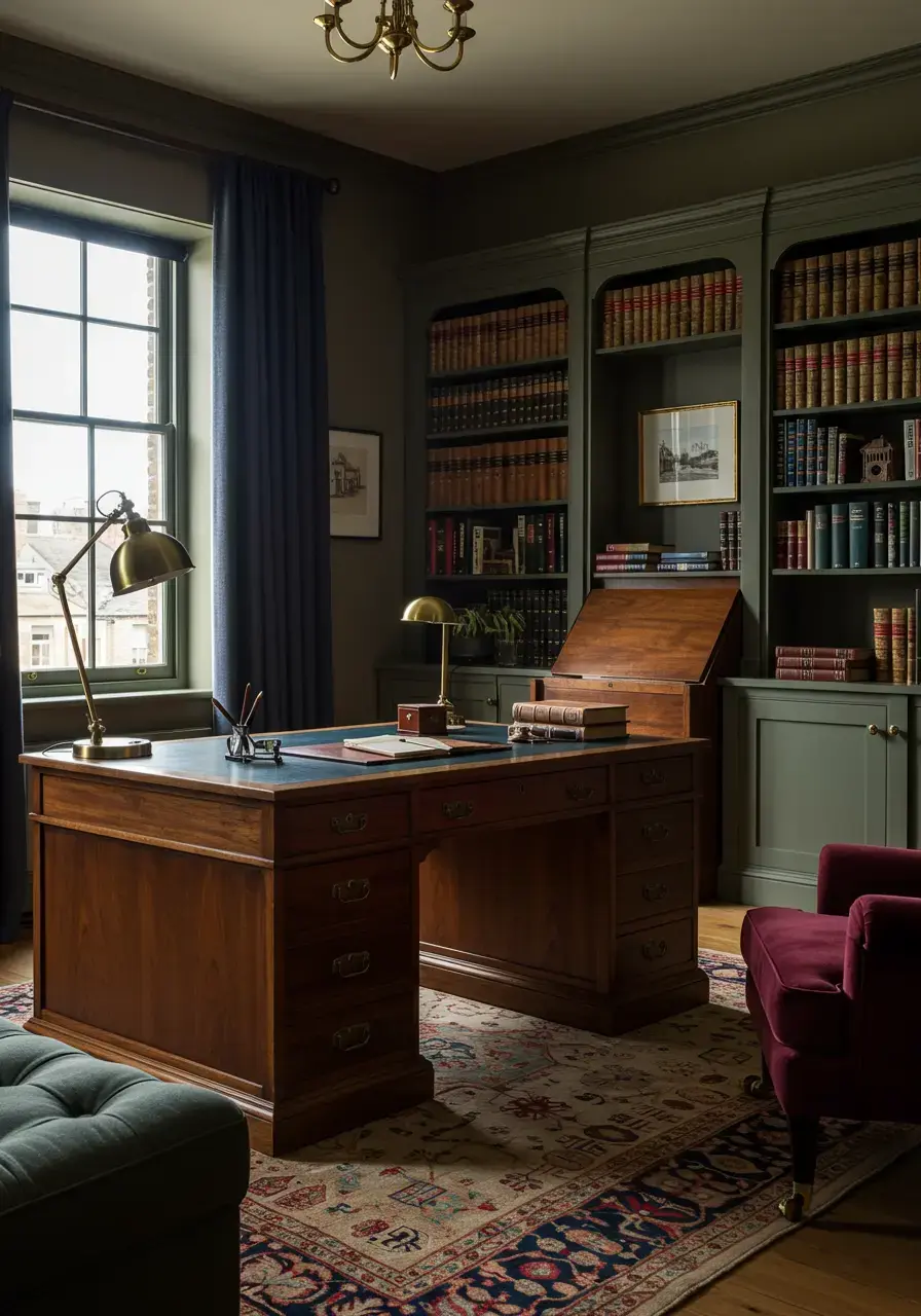 - Choose furniture with traditional silhouettes, such as a sturdy wooden desk with turned legs or a classic barrister bookcase.