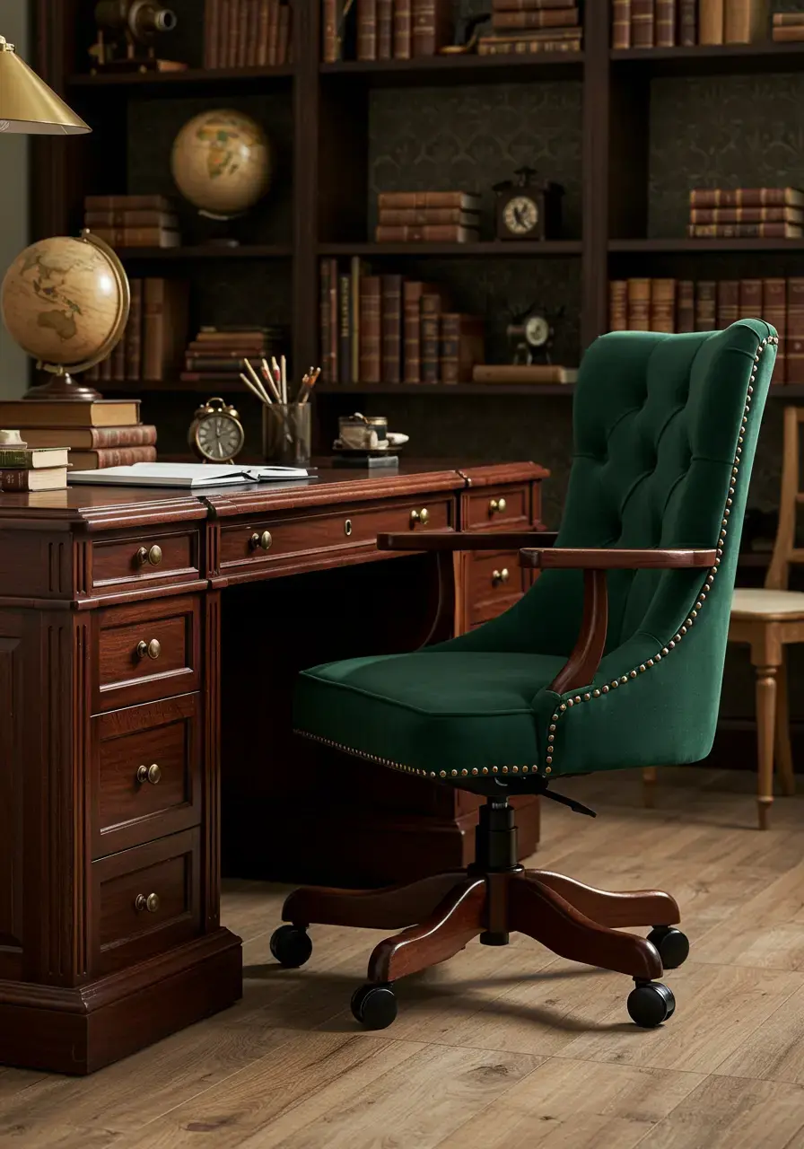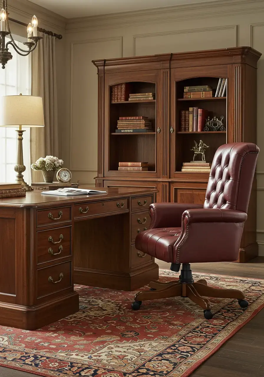 A well-matched desk and chair combination ensures both comfort for productivity and visual cohesion within the traditional aesthetic, making your workspace inviting and efficient.