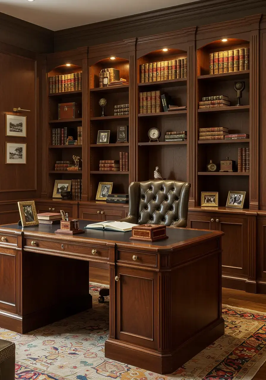 - Select a comfortable, ergonomic office chair that complements the traditional style, possibly upholstered in leather or a rich fabric.