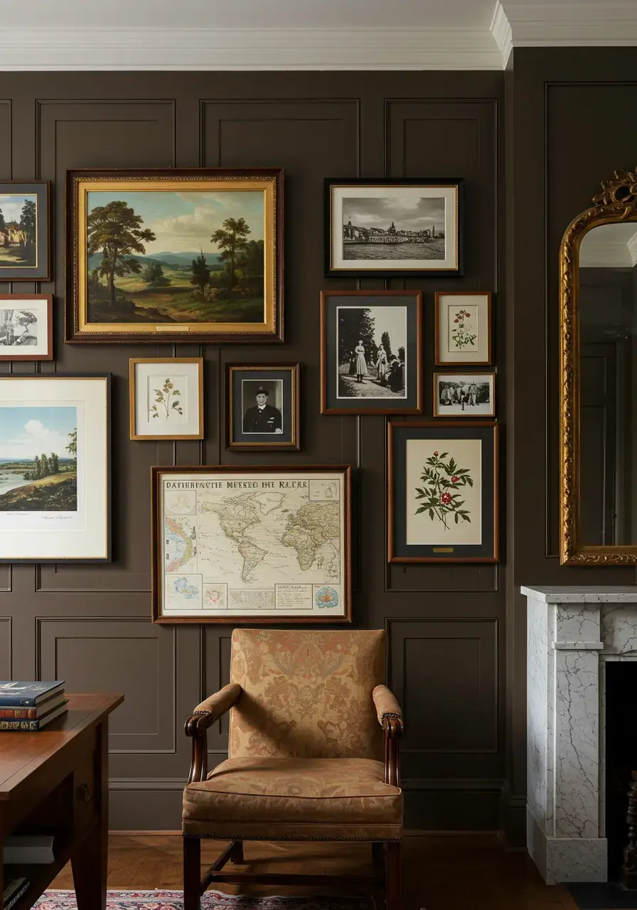 - Hang framed classic art prints, landscape paintings, or historical maps in ornate or simple wood frames.